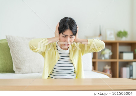 耳鳴りに悩む女性 騒音に悩む女性 不安を抱える女性 何かを考える女性