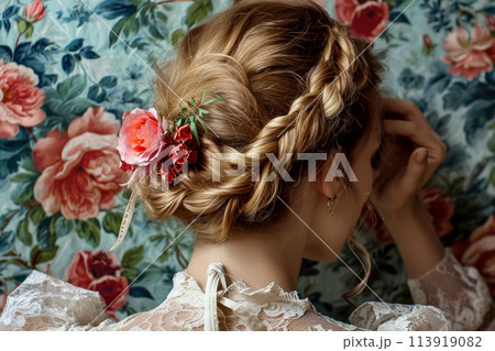 model braiding their hair with a braid and a pin in the background and a ribbon and a flower on their hair