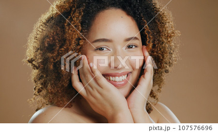 Happy woman, portrait and skincare in beauty, cosmetics or makeup against a studio background. Face of female person or model smile for dermatology, soft skin or facial spa treatment and grooming