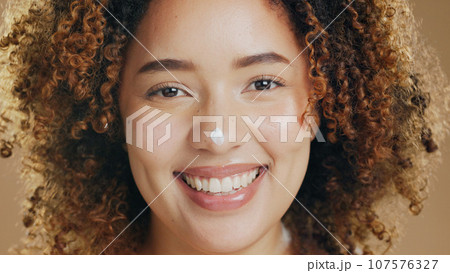 Skincare, cream and face of happy woman with dermatology, beauty or happiness on brown background in studio. Skin, care or portrait with cosmetics, lotion or sunscreen product for health or wellness