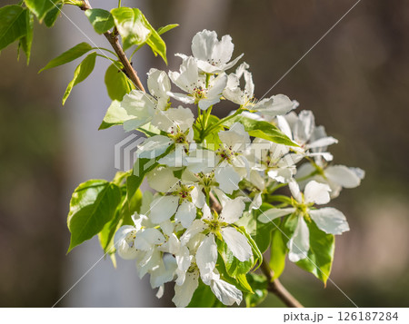 White blossoming apple trees in the sunset light. Spring season, spring colors.
