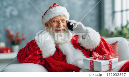 A man dressed as Santa Claus talking on a cell phone while sitting on a couch