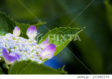梅雨の植物、黄緑から青紫へのグラデーションが美しいガクアジサイ(額紫陽花)の水彩画イラスト