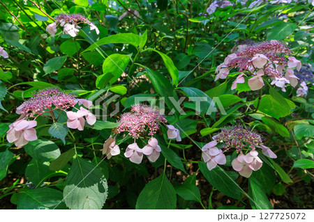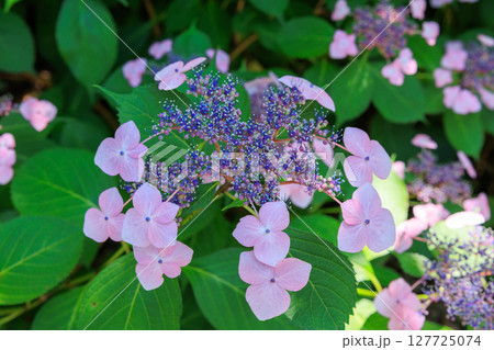 装飾花が薄紫色の額紫陽花をクローズアップで撮影した写真