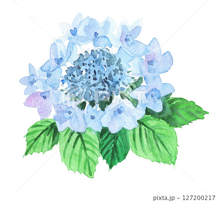 梅雨の植物、黄緑から青紫へのグラデーションが美しいガクアジサイ(額紫陽花)の水彩画イラスト