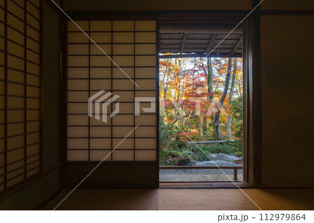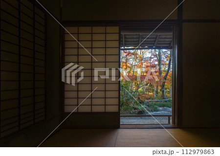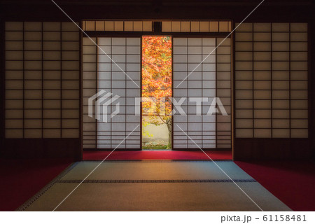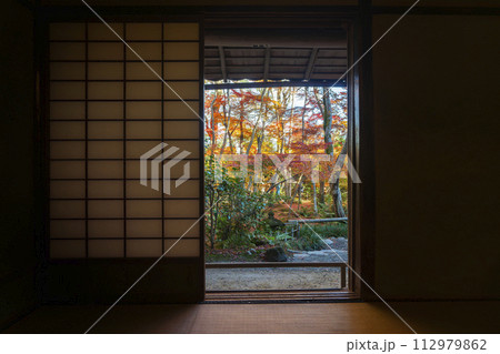 秋の京都・寺の窓から見える紅葉・額縁構図・シルエット