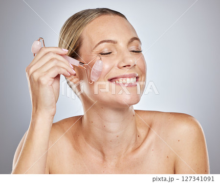 Woman, crystal and face skincare beauty with smile and exfoliate in studio for health, glow and cosmetics. Model happy, skin wellness and cleaning for cosmetic detox or dermatology by studio backdrop