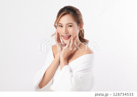Beautiful young asian woman with clean fresh skin on beige background, Face care, Facial treatment, Cosmetology, beauty and spa, Asian women portrait.