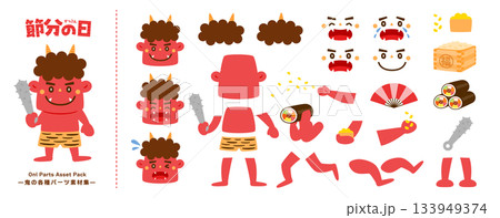 節分用鬼イラストセット:かわいい表情の顔パーツ・パンツ・アイテムなど:様々なポーズあり