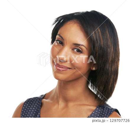 Black woman, studio portrait and smile with beauty, wellness and fashion by white background. Woman, model and isolated for aesthetic, makeup and happiness with glow skin, cosmetics and happy face