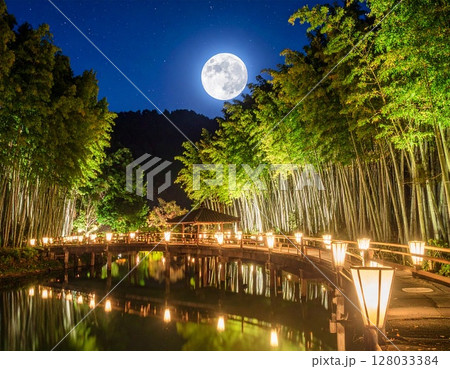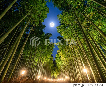 七夕の夜、月明かりに照らされる竹林と星空
