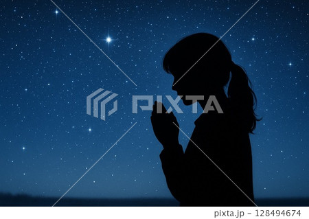 星降る夜に願いを込めて祈るシルエット