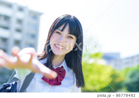 綺麗な新緑の、学校の登下校の途中でこちらに手を伸ばす女子高校生 通学登校下校 上半身