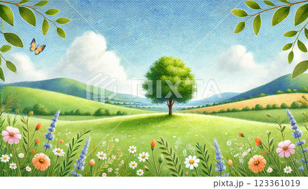 のどかな緑の丘とカラフルな草花が広がる優しい風景