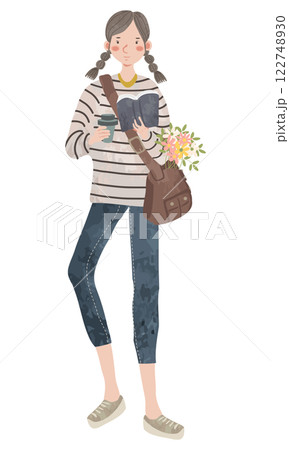 学校帰りに本を読んで勉強する女の子のイラスト(素朴な水彩タッチ)