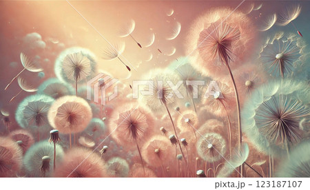 飛び散る綿毛と風に揺れるタンポポの幻想的な風景