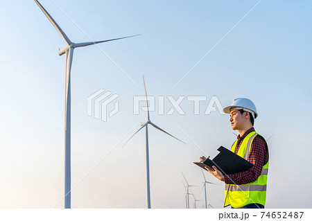 Man engineer at work is wearing a white protective helmet and taking notes with a clipboard in a field with wind turbines, as the sun sets. Clean energy concept