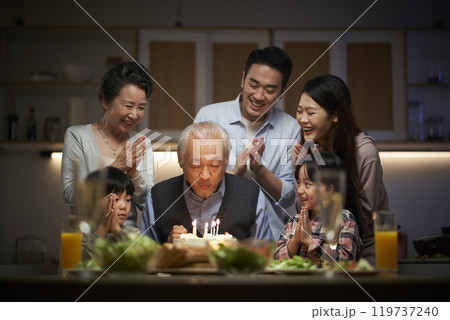 Birthday surprise. Happy Asian family grandparents and mother celebrating enjoy birthday party with cake of granddaughter at home in night time