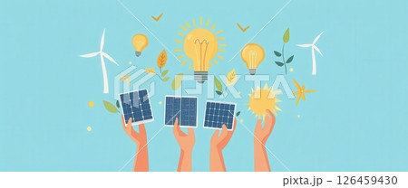 Renewable energy on Earth, solar panels and wind turbines. 3D rendering