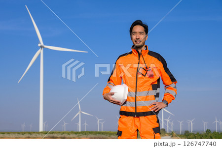 Renewable energy engineer in orange safety uniform standing at wind turbine farm