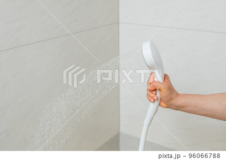 【風呂掃除をするミドル主婦 スプレーとシャワー 水栓有】