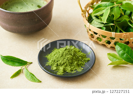 皿に盛った緑茶とほうじ茶と玄米茶の茶葉