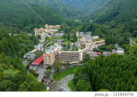 群馬県中之条町の四万温泉街を俯瞰で撮影した落ち着いた雰囲気の温泉地の空撮風景