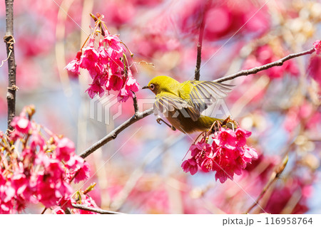 美しいカンヒザクラの間を飛び回って花の蜜を吸う可愛いメジロ(メジロ科)。東京都文京区小石川植物園