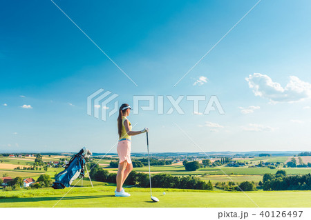 Fit woman looking at the horizon on the green grass of a golf course