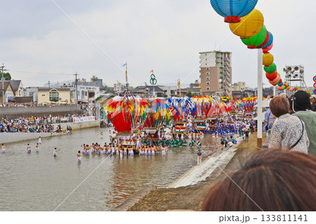 福岡県田川市の風治八幡宮川渡り神幸祭で彦山川に入る幟山笠
