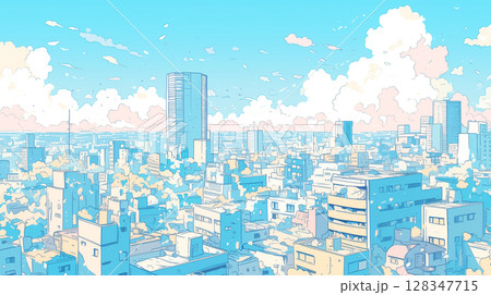 夏の青空と雲、都市の高層ビル群、明るく澄んだ空気感が感じられるシティスケープのイラスト
