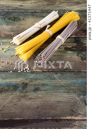 Noodles soba, somen and italian spaghetti on wooden background. Traditional Japanese food.
