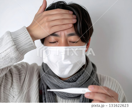 熱が出てひたいに手を当てる若い男性