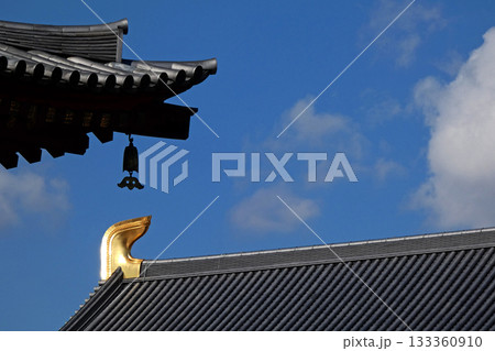 青空の下の鴟尾が輝く薬師寺の瓦屋根と三重塔の風鐸