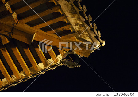 ライトを浴びる寺の軒と風鐸
