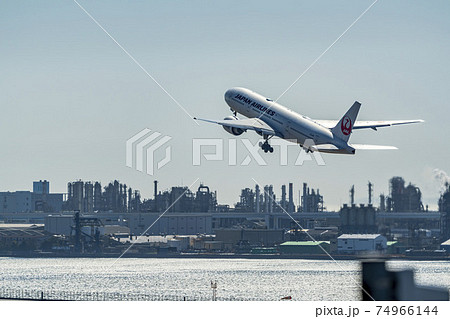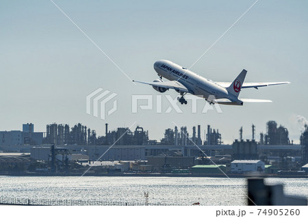 空港の風景 離陸中の飛行機と工場群 東京都大田区