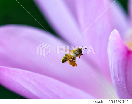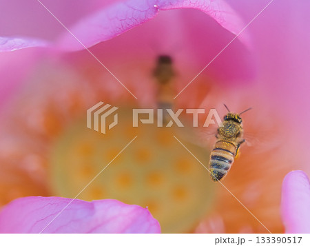 蓮の花を飛ぶミツバチ