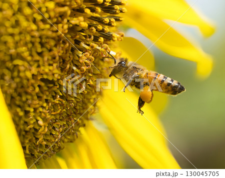 ヒマワリの蜜に飛ぶミツバチ