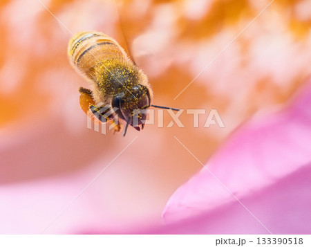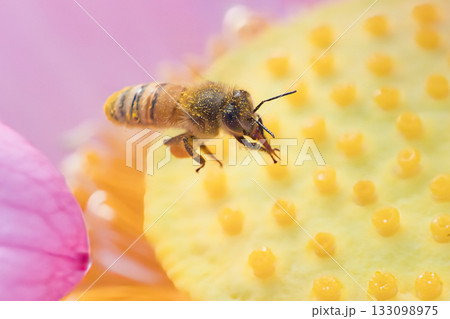 蓮の花の蜜を吸うミツバチ