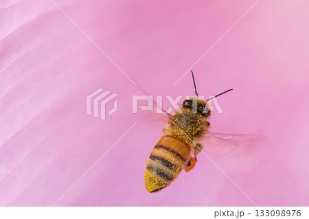 ピンクの花の蜜を吸うミツバチ