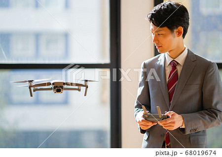 ドローン ビジネス スーツ オフィス 男 男性 1人 少人数 飛行中 商談 操縦 午前 明るい