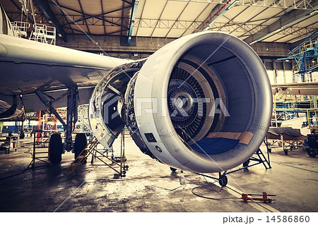 Passenger aircraft on maintenance of engine and fuselage repair in hangar
