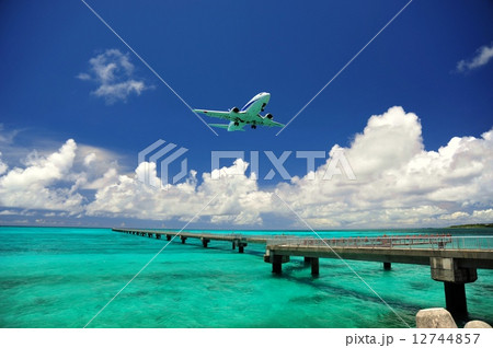 南海離島のエメラルドグリーンの海岸から着陸する飛行機