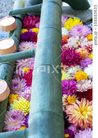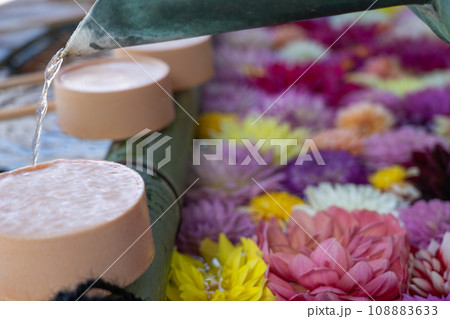 奈良県明日香村にある西国七番札所岡寺の綺麗な花手水を撮影したもの
