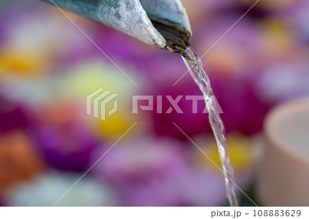 奈良県明日香村にある西国七番札所岡寺の綺麗な花手水を撮影したもの