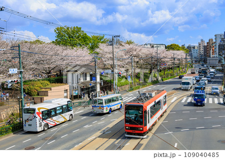 3月 北区141都電荒川線と飛鳥山公園の桜・音無橋交差点