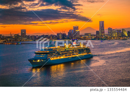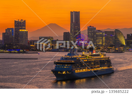 日本の横浜都市景観飛鳥Ⅲと富士山、みなとみらいが競演…希望の光…日本の豪華客船時代の幕開け