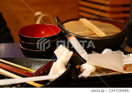 飲食店で食べ終わった後の和食のお椀と割り箸 食後イメージ