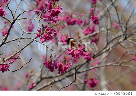 青空をバックに満開に咲く寒緋桜の花の蜜をヤマガラが吸う
