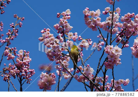 青空バックに満開の河津桜の蜜を求めてメジロやヒヨドリが集まる